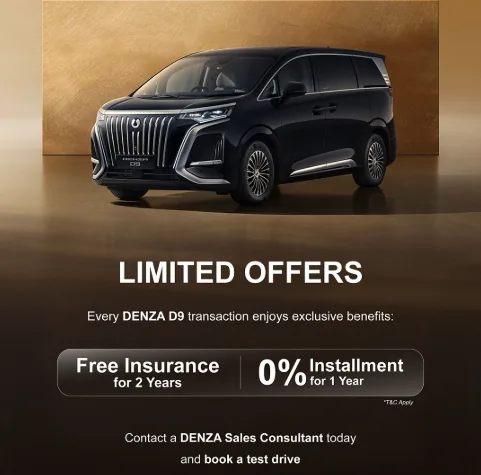 Promo Denza BSD Februari 2026 February 14, 2026 Step into refined mobility with DENZA D9. Enjoy special ownership benefits on DENZA D9 with free insurance for 2 years and 0% installment for 1 year. Contact our Denza Arista Sales Consultant and start your journey today.